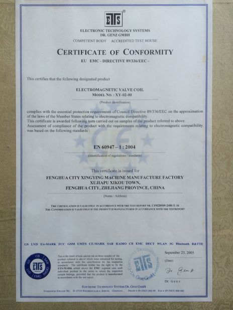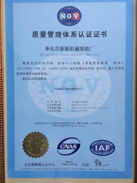 Standard:ISO9001 Number:05310Q10751R0S Issue Date:2014-04-30 Expiry Date:2017-04-30 Scope/Range:The production of pneumatic hydraulic magnetic coil Issued By:Beijing NGV Certification Center |